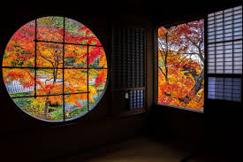 まるで季節を切り取ったような茶室の丸窓からの風景は、